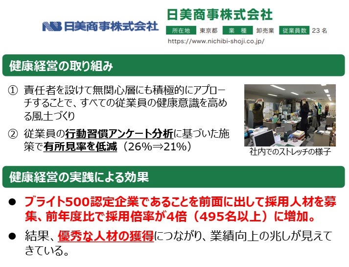 日美商事株式会社の事例からは、健康経営への積極的な取り組みが企業イメージの向上につながり、求職者から「選ばれる会社」になることで、採用活動に好影響をもたらしていることがわかります。